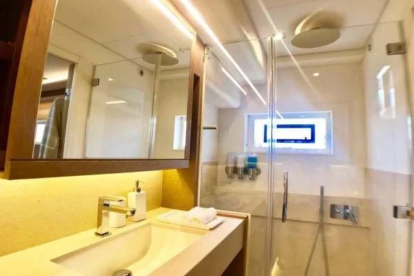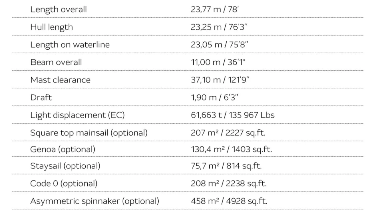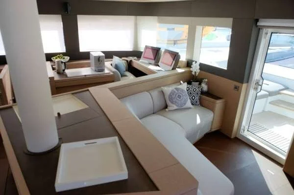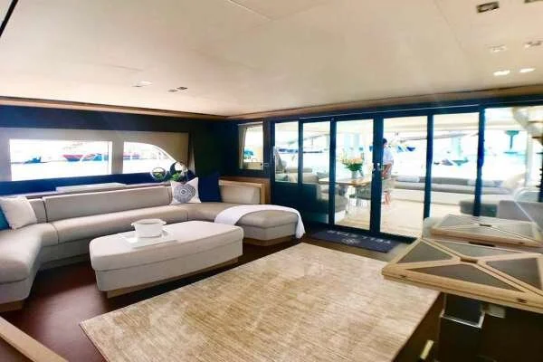 The interior has a layout optimized for space and comfort. The salon is bright, comfortable and roomy and opens not only to the aft cockpit but also directly to the forward cockpit for seamless movement around the yacht. There is a massive flybridge affording an uncompromising 360* view.